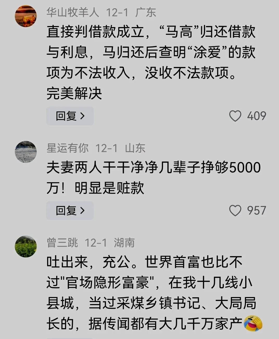 看了这起贪官入狱后其家属追还借款的案件,网友们无比感叹!网友们认为,无论借钱方的老板和出借方的贪官家属,其实双方都不是什么好鸟。按照正常收入,国家干部怎么可能拥有资金几千万?另外,据中国裁判文书网显示,湖南省委常委张文雄落马后,其妻子涂爱芳通过法院主张的权益已经超过了两亿元。如果不贪,怎么可能那么有这么多的资产?