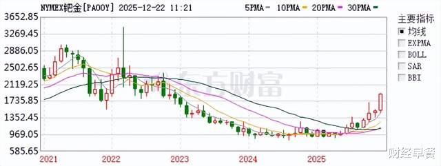 请看数据:纽约NYMEX铂金主力合约一度突破2100美元/盎司,创下2008年3月以来新高!而钯金期货也一度突破1900美元/盎司,