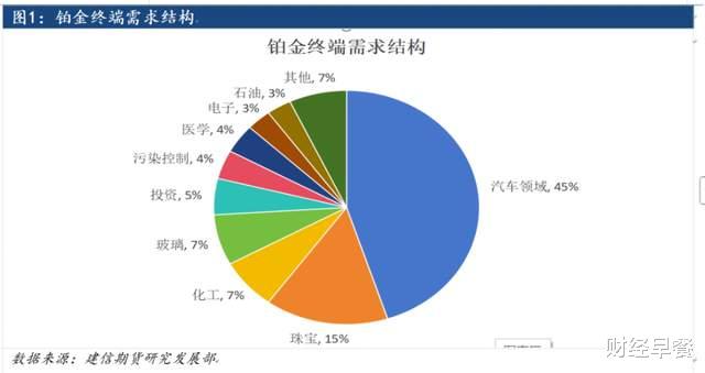 据建信期货整理,和黄金白银不同,投资需求在总需求中的占比仅有5%,珠宝消费占总需求大约15%,而工业用途占到接近80%,远高于黄金的7%和白银的50%。铂在工业领域用途广泛,最核心的用途是汽车尾气净化用催化剂。
