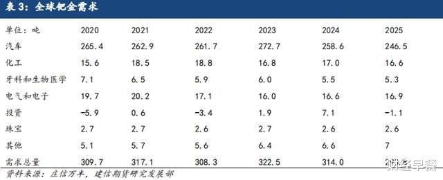 需求面上,钯金的工业属性远远强于铂金,主要用作汽车尾气催化剂,而随着新能源汽车的大行其道,钯金的需求受到强烈的冲击:据庄信万丰,2024 年全球钯金的总需求量为314吨。其中汽车钯金需求量为258.6吨,占总需求量的比重约82.3%,其中汽车催化剂为主要应用领域。由于汽车领域钯金需求下降,2025年全年钯金需求或下滑6.4%至293.8吨。