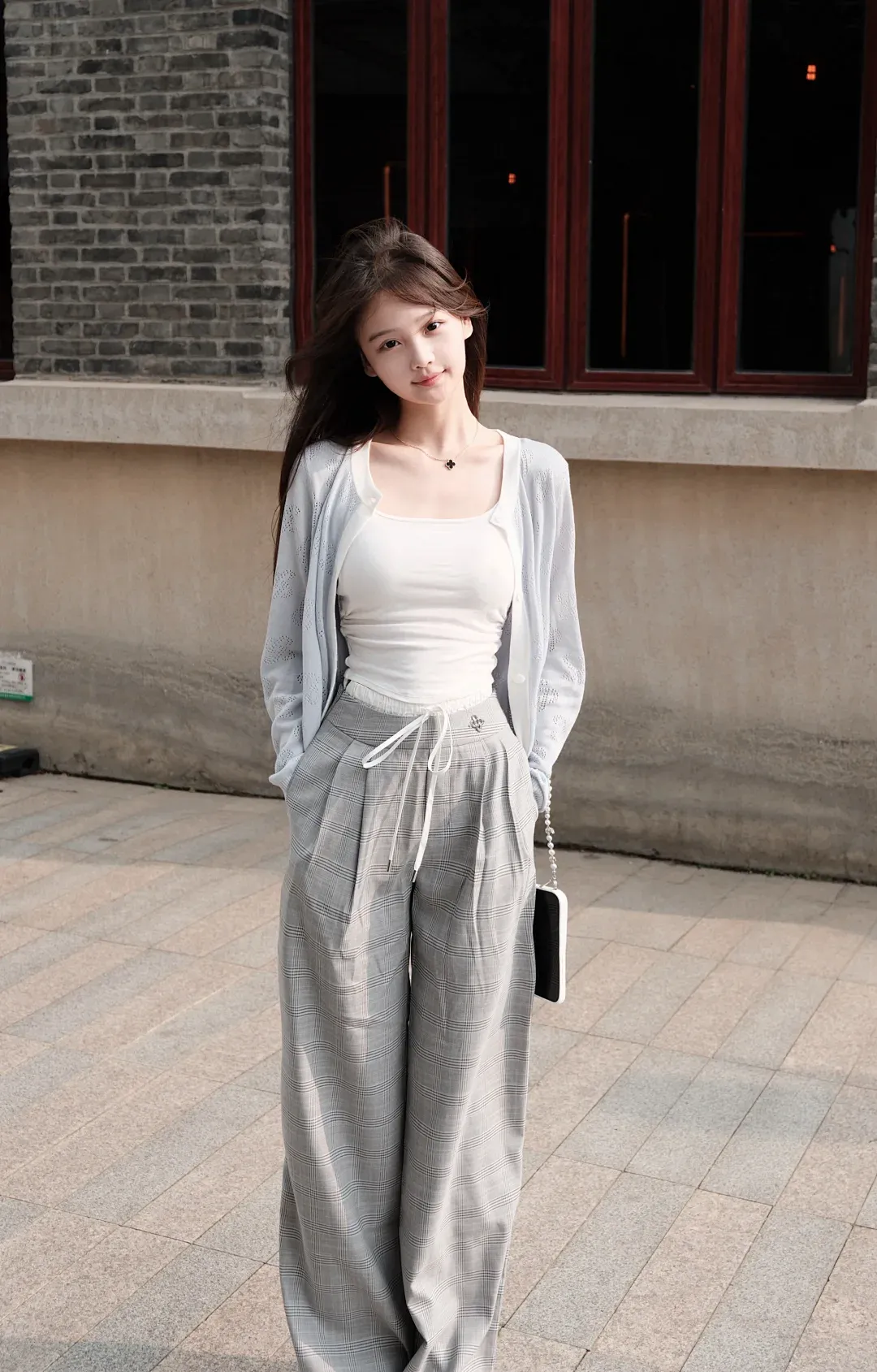 女生身材娇小。身穿白色背心,外搭浅灰色针织开衫,简约清新;下配浅灰色格子阔腿裤,抽绳设计自然勾勒腰线。整体松紧有度,在随