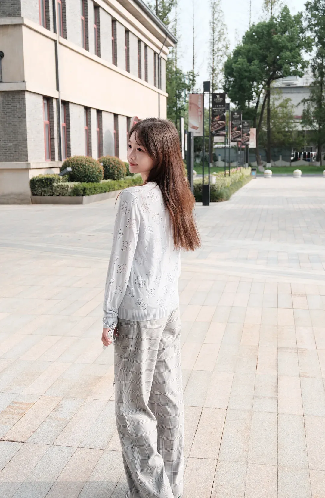 女生身材娇小。身穿白色背心,外搭浅灰色针织开衫,简约清新;下配浅灰色格子阔腿裤,抽绳设计自然勾勒腰线。整体松紧有度,在随性中不失比例,显得轻盈又可爱。