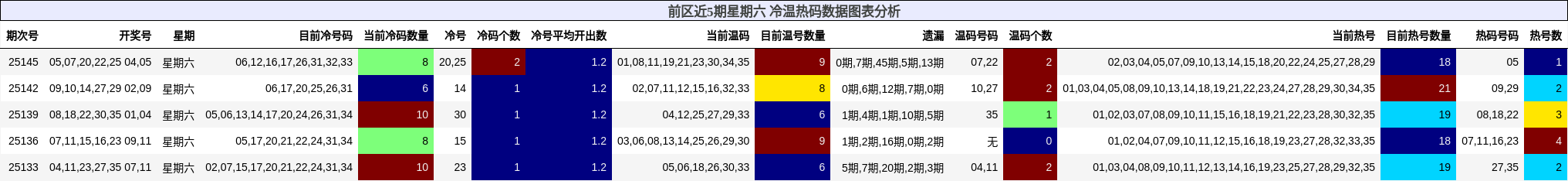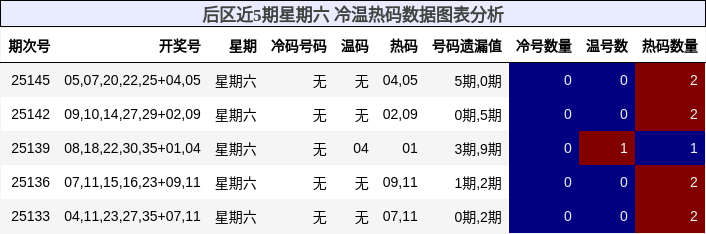 上图清晰呈现了近5期星期六前区冷、温、热码的分布与变化趋势。热码虽多,但已显疲态;温码在第25147期集中爆发,形成“温码补位”信号;冷码虽未大规模出,但33号已进入“临界区”,具备突破可能。