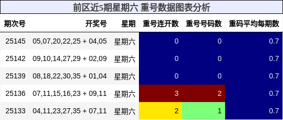 上图展示了近5期星期六前区重号的分布情况,可见重号在第25144期和25145期连续出现,但25146期与25147期连续断档,形成明显“冷态”信号。因此,本期前区推荐不包含重号,避免追热过头。