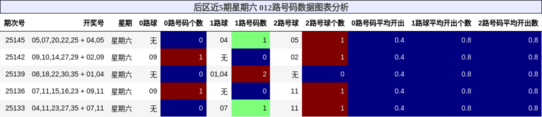 上图直观展示了近5期后区012路的分布情况,1路与2路连续高开,0路长期缺位,形成“0路冷态”格局。本期0路冷出概率上升,06号作为0路温码,具备“冷出+温码”双重逻辑支撑,是后区核心推荐。