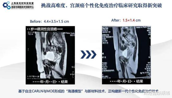 一项针对85岁高龄浸润性宫颈癌患者的探索性研究尤为典型。该患者因年事已高、病情严重曾一度放弃治疗。创新中心通过基于患者的基因、免疫、蛋白等多组学数据构建多模态模型,适配对应性个性化靶向免疫治疗技术,实现驯化免疫记忆、靶向识别、免疫归巢、能量重塑,并通过辅助策略调节肿瘤微环境释放靶向与固定靶点,实现解除屏障形成靶向识别与抗癌机能重构,3个月内,患者肿瘤从4.4×3.5×1.5cm显著缩小至1.5×1.4cm,展现出惊人的治疗效果,为晚期患者带来了新的希望。周双念介绍,个性化免疫治疗在技术层面已经实现可根据每个患者的具体情况制定方案,从而提高治疗效果。