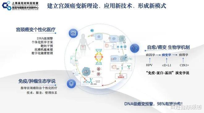 创新中心与研究院基于周双念教授提出的宫颈癌变“免疫-蛋白-基因”演变学说与机体癌变后其“免疫微生态”与“肿瘤微生态”间的生物屏蔽学说,开发拥有自主知识产权的宫颈癌变DNA级预警cD-L1检测技术、个体化医学方案技术、靶向与协同干预体系、数字化健康管理、保险保障等为一体的个性化医疗诊治体系。实施适龄妇女宫颈癌变早期筛查,实现DNA级早期预警并指导个体化靶向干预,该检测技术对既往HPV感染人群还可实现精确研判一过性感染、自愈性感染与癌变驱动类感染的分层分级管理,这一技术的突破填补了全球性空白,实现病因学向病变学跨越,有效提升宫颈癌早防早治水平。周双念教授在报告中阐释了这一学说的科学内涵:宫颈癌并非由HPV感染直接导致,而是HPV病毒持续感染后,突破人体多重免疫屏障,蛋白整合入宿主细胞DNA,最终诱发体细胞原癌基因突变而形成的,人体免疫系统的稳态和韧性是决定感染走向自愈还是癌变的关键,该学说从免疫微环境、病毒蛋白作用与宿主基因突变三者互动,引发机体免疫微生态与肿瘤微生态间相互屏蔽,致使肿瘤细胞无限增殖,揭示了宫颈癌变的发生发展机制。