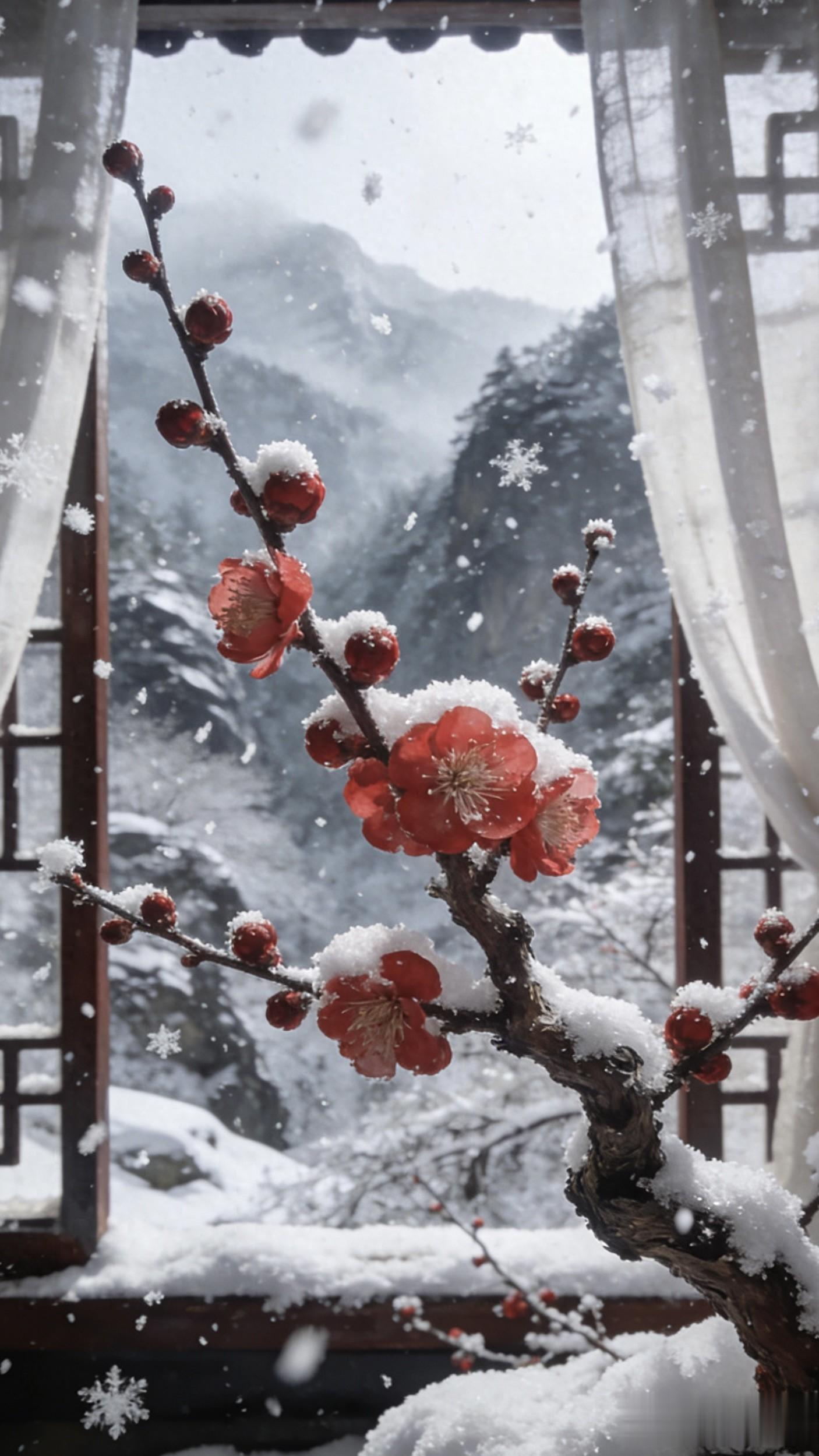 梅蕊初绽,散彩于空山幽谷;雪花轻舞,随意穿拂过帘幕窗棂。一红一白,一静一动,勾勒出冬最清绝的诗意,也藏着岁月最温润的留白。梅花散彩向空山,是寒冬里的风骨独韵。不恋尘世喧嚣,独向寂静山野,花苞缀满枝桠,或含苞待放,或傲然怒放,一抹嫣红点缀在苍茫山色间,似烈火燃于冰雪,似霞彩映于幽谷。
