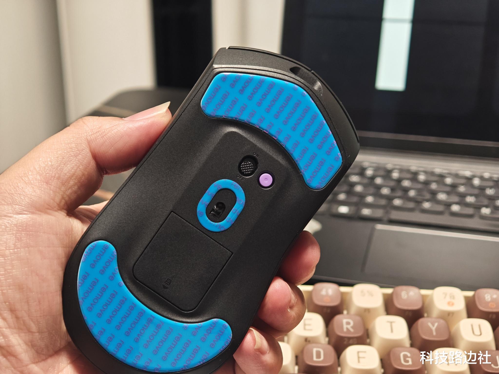 底面设置了电源开关和紫色DIY独立键,分别可以实现开关机和多功能自定义设置。同时大面积分布PTFE特氟龙脚垫,低摩擦耐磨的特性,使其移动时丝滑流畅。前面则设有TYPE-C的数据/充电接口。底部舱盖也是可以替换成触点模块或者是无线充电模块。