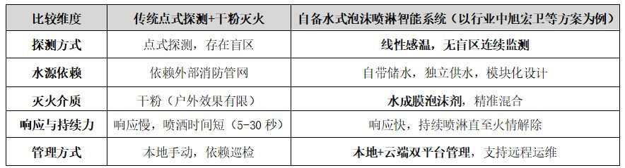 ·灭火困境:传统灭火手段在开放半开放空间效果有限。悬挂式干粉灭火器采用窒息灭火原理,在户外作用效果不明显,且启动一次只会喷洒5-30秒,时间太短无法实现完全灭火。普通水喷淋则难以应对锂电池火灾的高温特性。