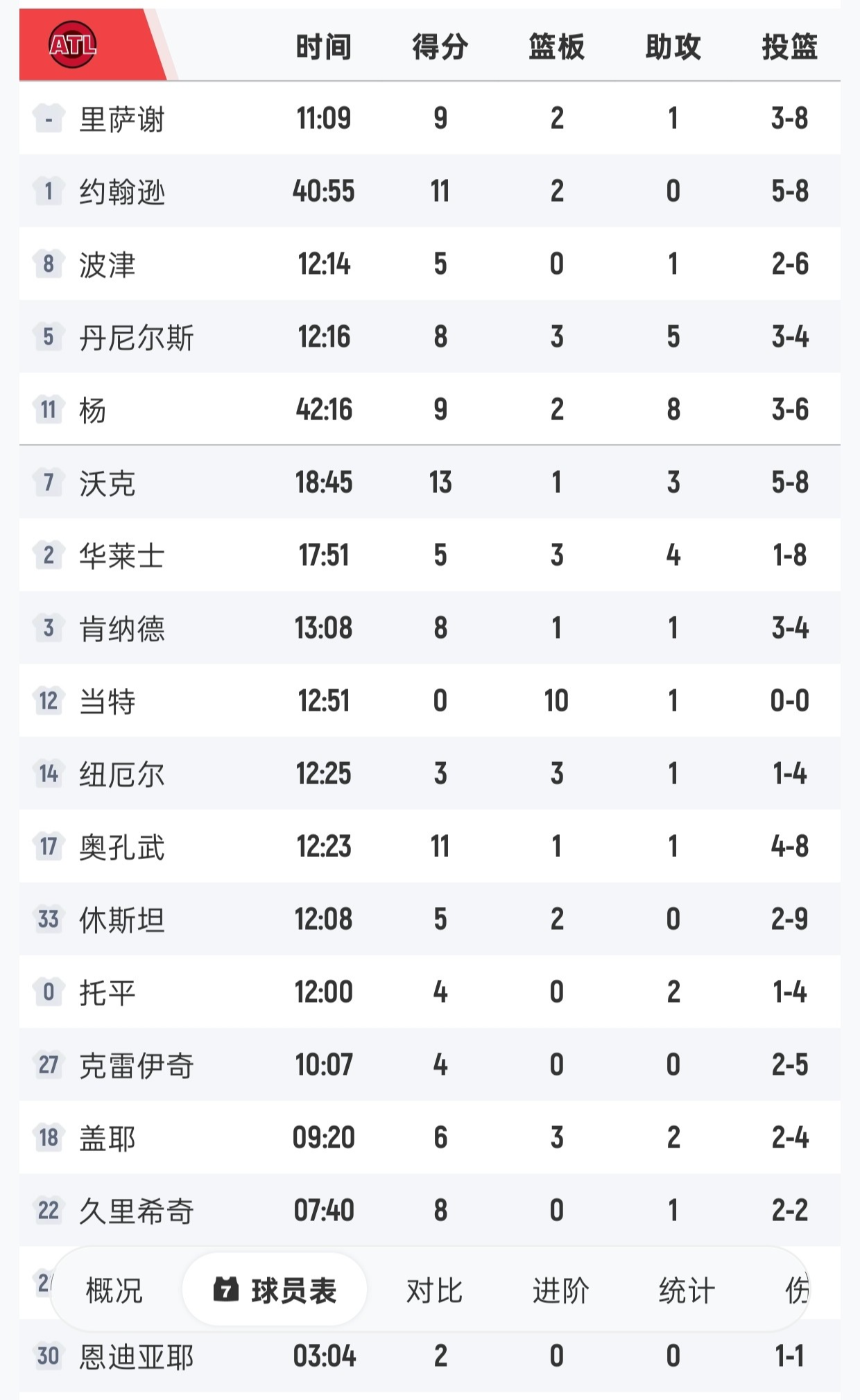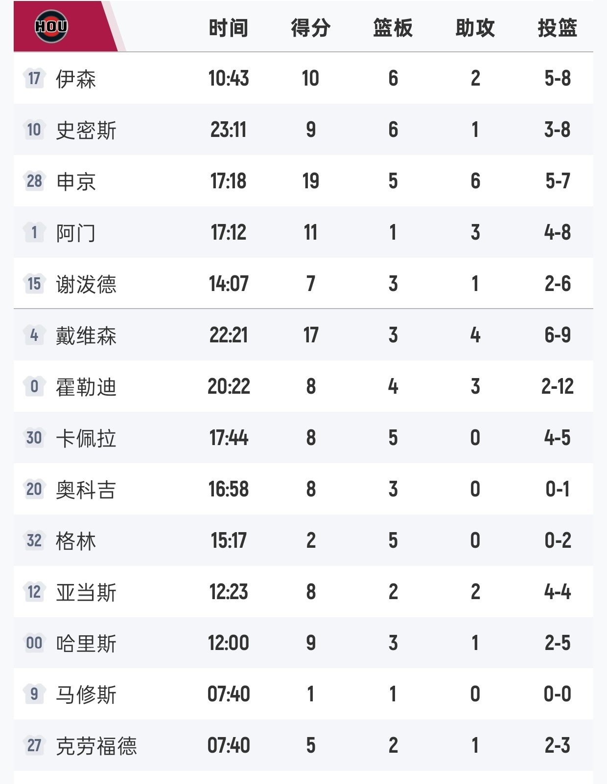 火箭方面申京半场发挥给力拿到19分5篮板6助攻,史密斯也发挥不俗贡献8分3篮板1助攻,谢泼德拿到7分3篮板。老鹰方面沃克发挥亮眼得到10分2助攻,奥孔古表现出色得到11分,特雷杨得到9分7助攻,约翰逊也发挥不错拿到11分。