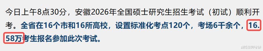 全省在16个市和16所高校,设置标准化考点120个,考场6千余个,16.58万考生报名参加此次考试。较25考研(18.83万人)减少2.25W,降幅11.9%。