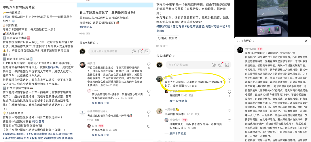 小红书上就有挺多用户在吐槽零跑的智驾,城区 NOA 的安心率低,有的用户在试驾的时候,最基础的自动泊车都能出事故,实在令人捏一把汗。