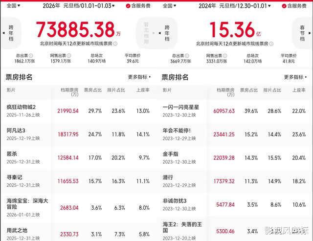 国产新片乏力,元旦档票房7.38亿不及预期去年12月31日和今年1月1日,中国内地电影市场共有11部新片上映,包括《匿杀》《寻秦记》《用武之地》《过家家》《他年她日》等有大明星或大导演加持的国产重磅新片。