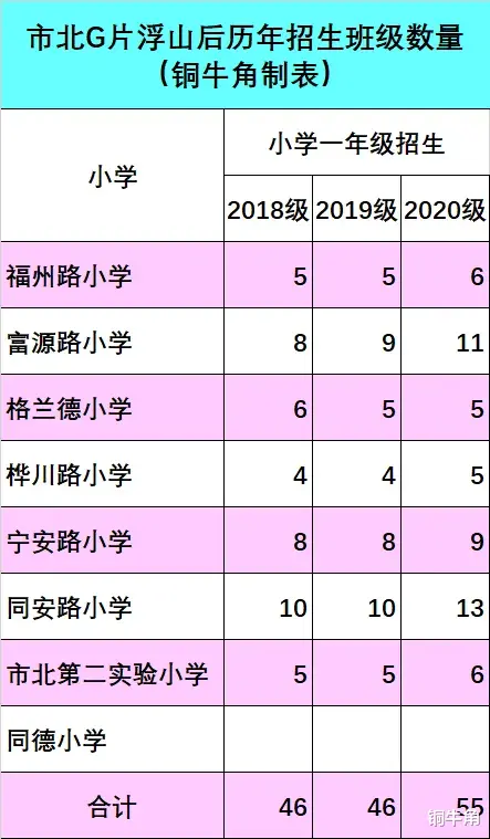 市北区浮山后6所公办小学今年毕业班分别为:福州路5个班、富源路9个班、桦川路4个班、宁安路8个班、市北二实小5个班、同安路10个班,合计共有41个毕业班,比去年多了一个班。格兰德小学5个毕业班,比去年少了一个班。市北区浮山后固有生源今年同比增加大约28人。