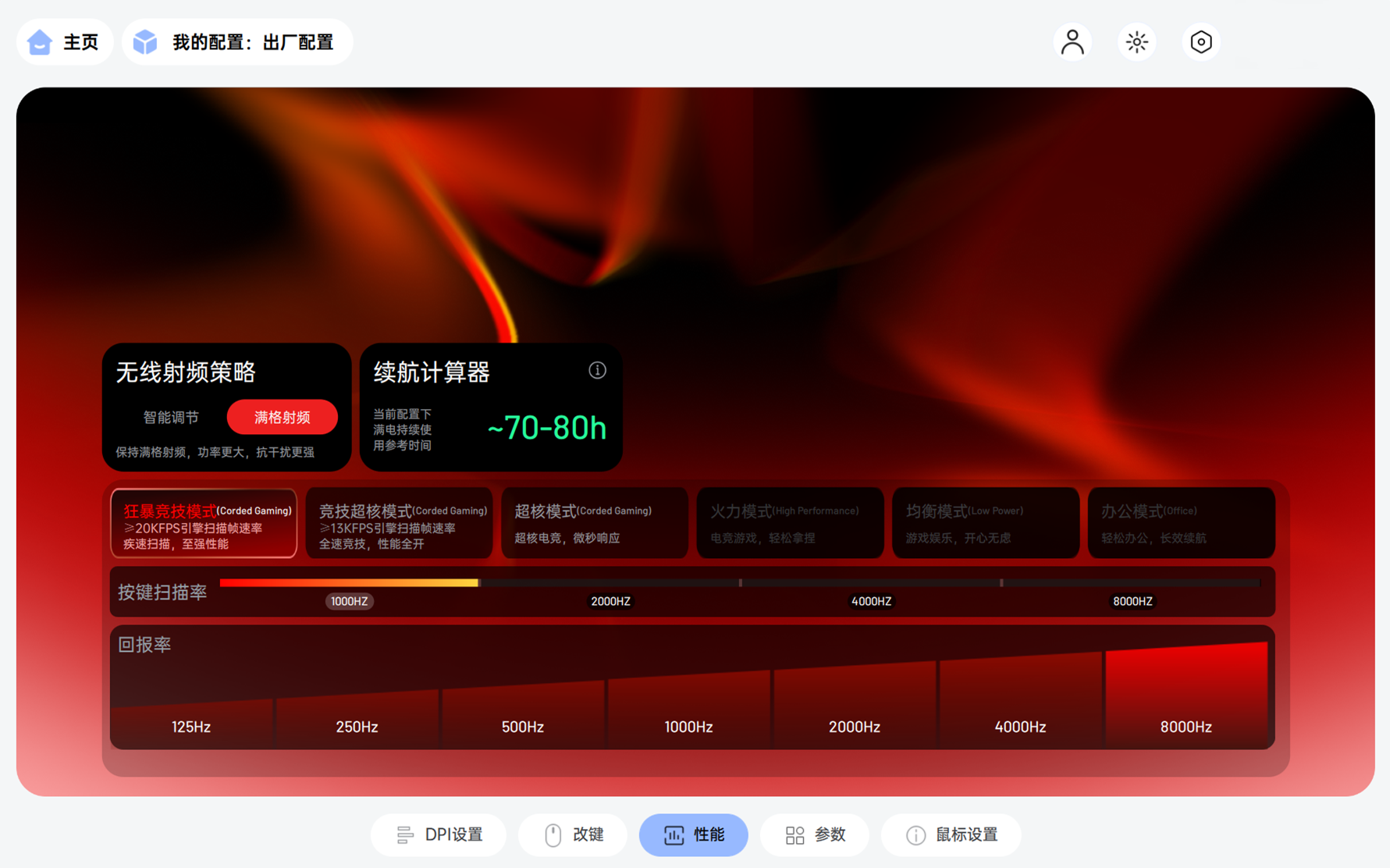 狂暴竞技模式下,它能跑到8000Hz回报率+≥20000FPS静态扫描速率,这配置已经是职业级的响应速度;但就算开足马力,续航也能撑120小时,要是切到1K回报率,甚至能连玩750小时(小半年不用充),性能党不用再“为续航妥协”。