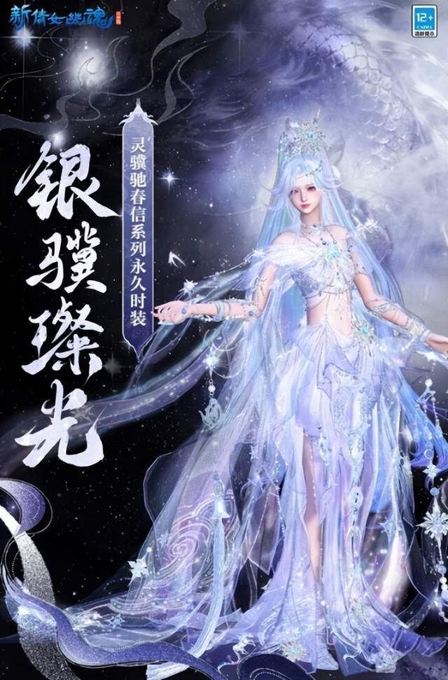 银骥璨光以天马与星霜为核心灵感,质感与设计感双重buff加身。女款采用高腰广袖版型,兼顾美观与灵动性,渐变裙裾层叠铺展,行走间如踏雪翻云,星芒饰品点缀其间,天马踏星河的氛围一下子就上来。而男款则侧重侠士风范,衣身选用银白锦缎面料,触感细腻且自带自然光泽,银线绣制的星河图卷藏于衣料纹理中,走动时随光影流转若隐若现,尽显灵动飘逸。肩甲与护腕线条硬朗利落,马鞍样式腰封也成为点睛之笔。