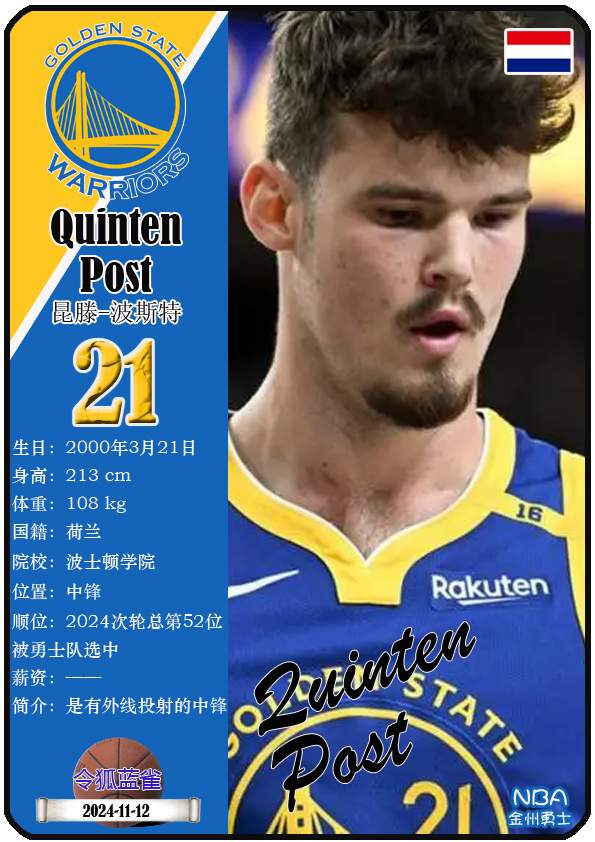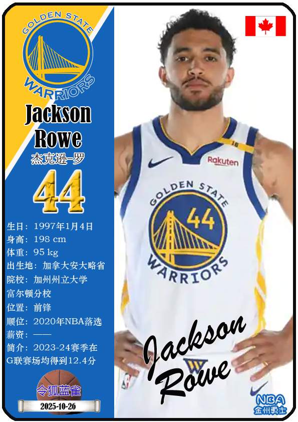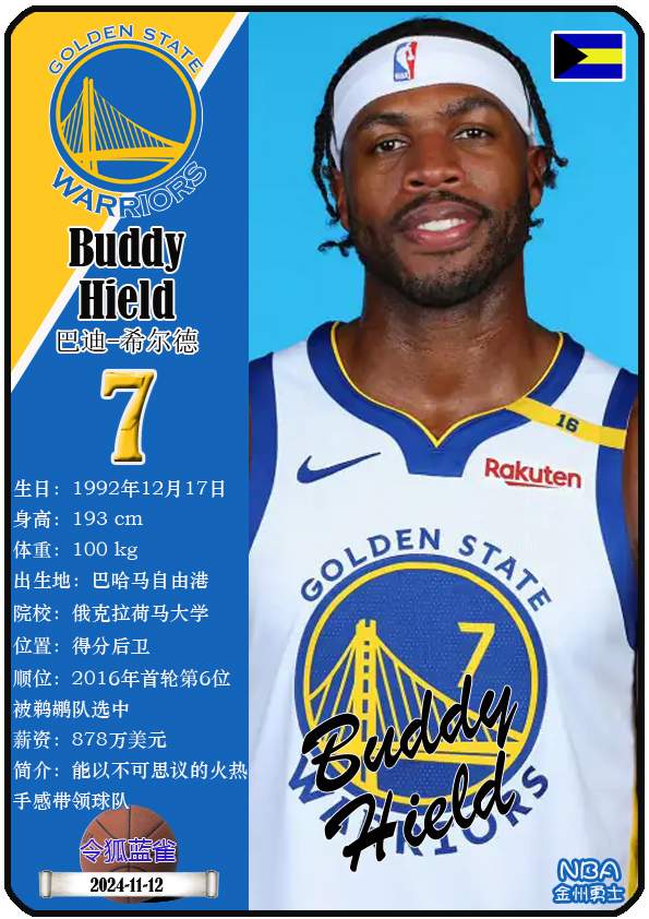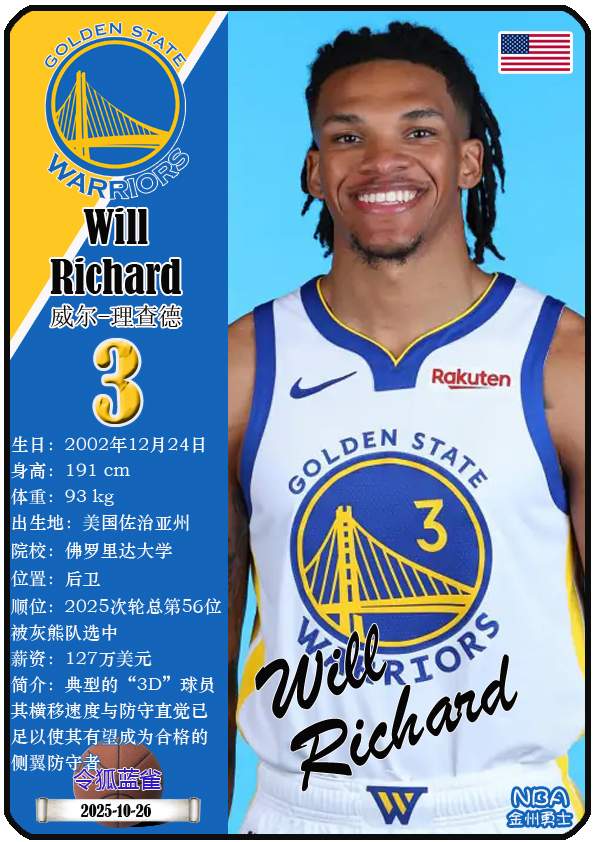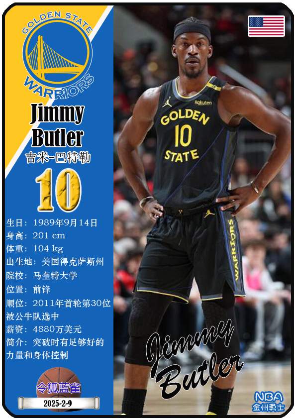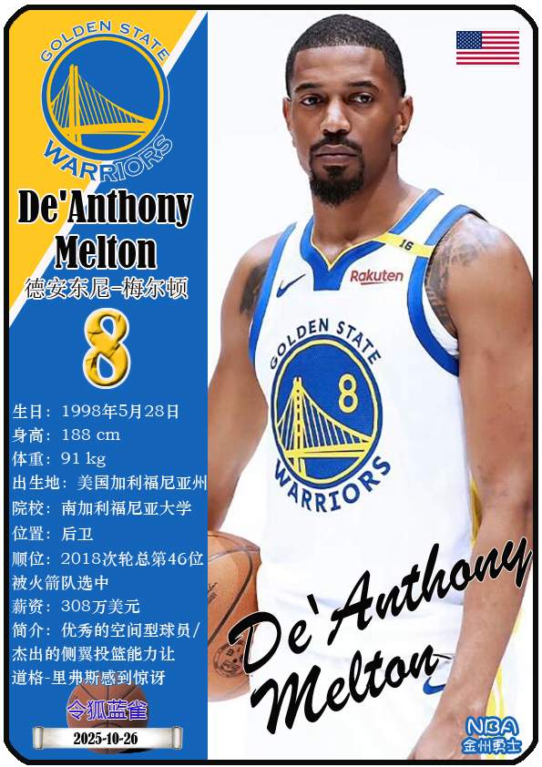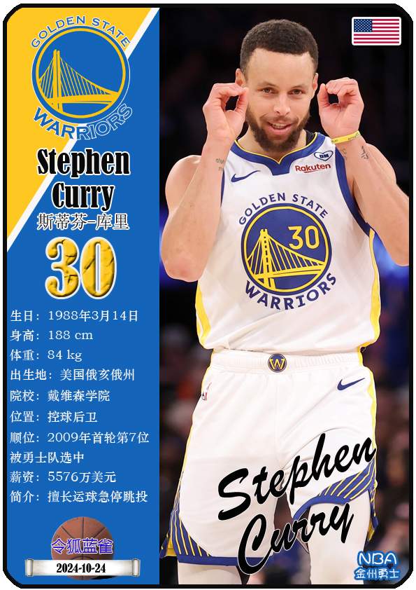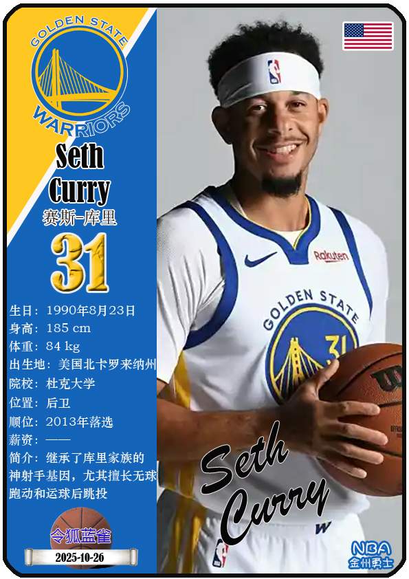 NBA金州勇士队成立于1946年,距今已有79年历史。截至2025年10月26日,球队主教练是史蒂夫·科尔,队内拥有球员斯蒂芬-库里、吉米-巴特勒、德雷蒙德-格林等。本期以球星卡的形式展示目前NBA金州勇士的18名球员(按球衣号码排序):