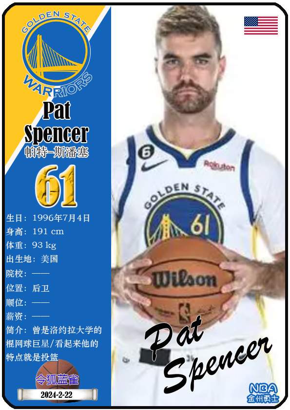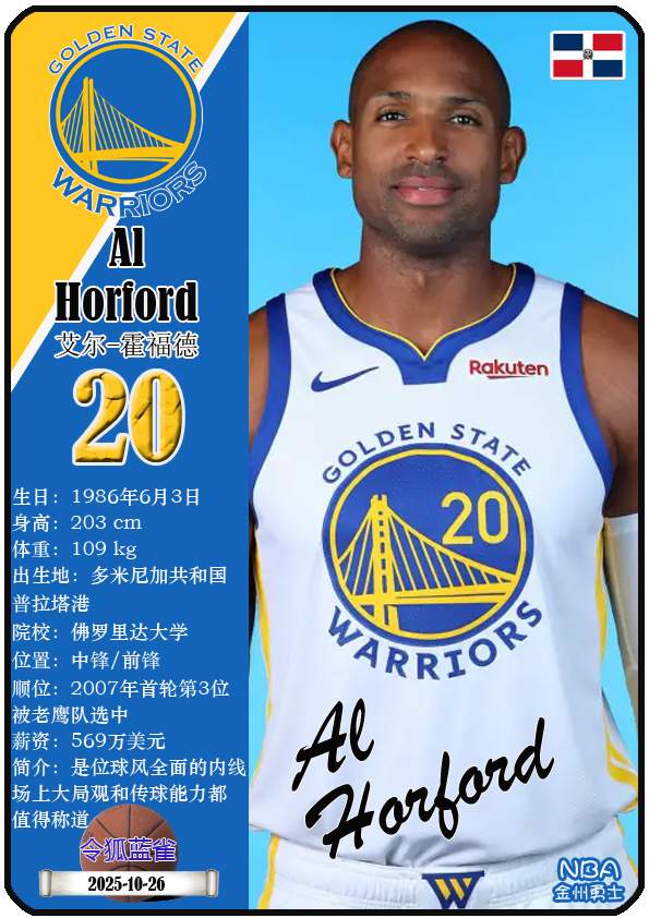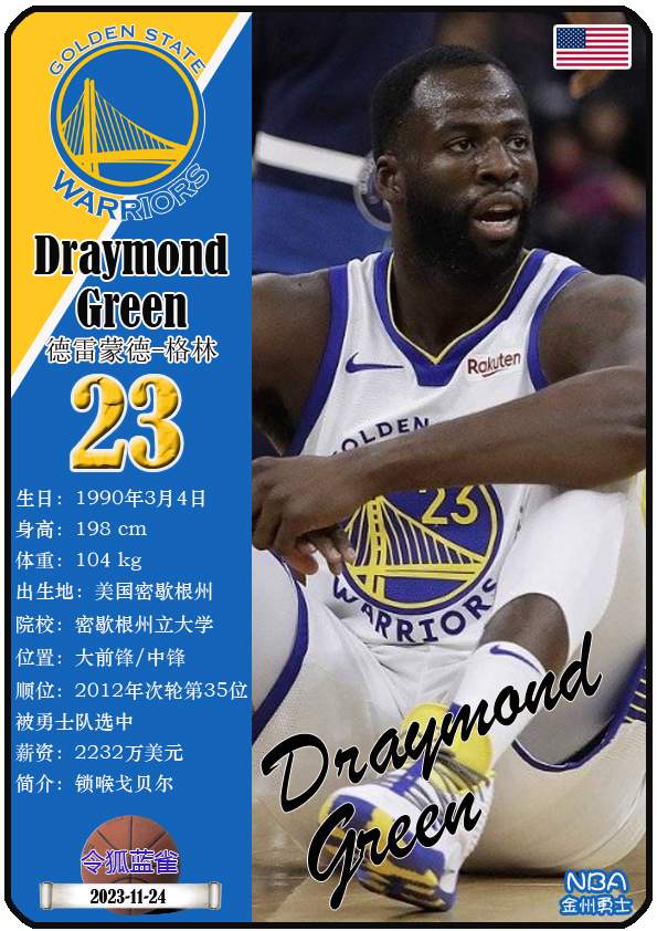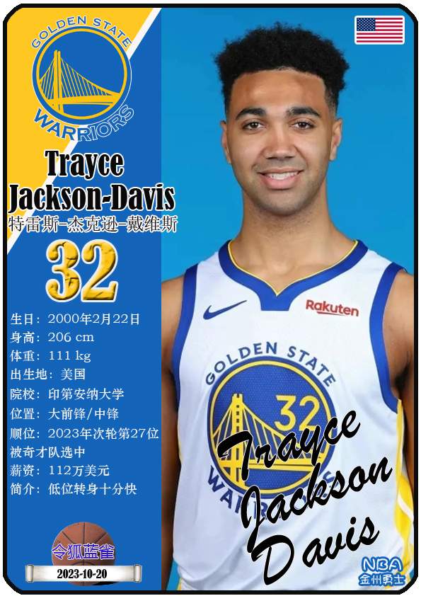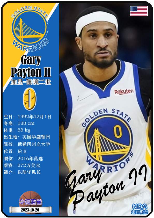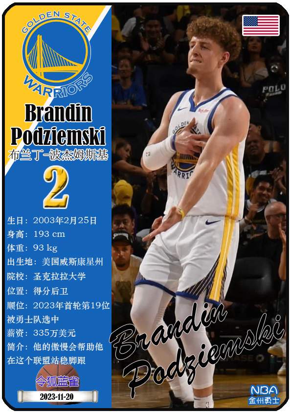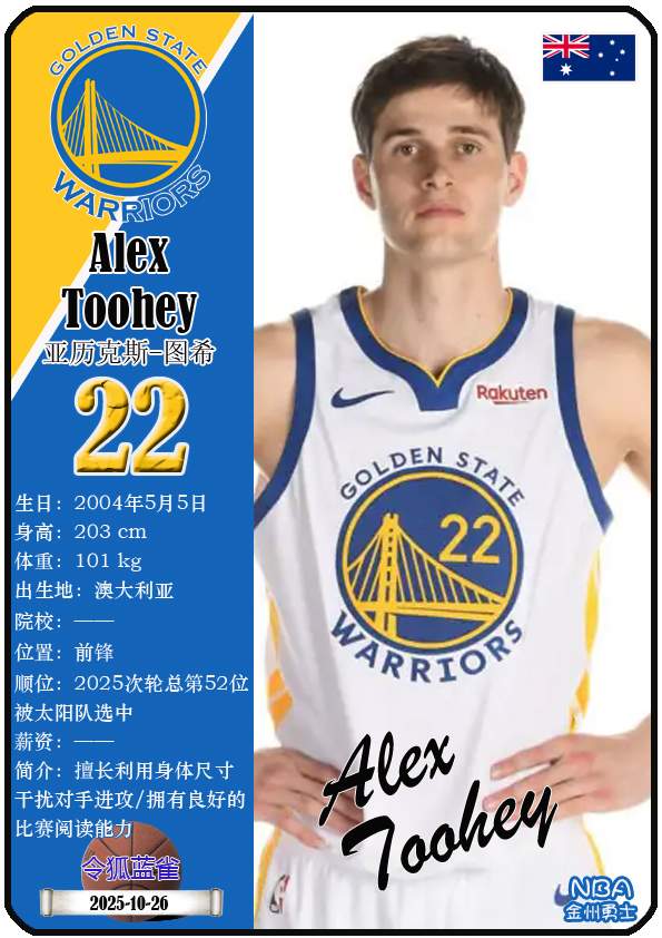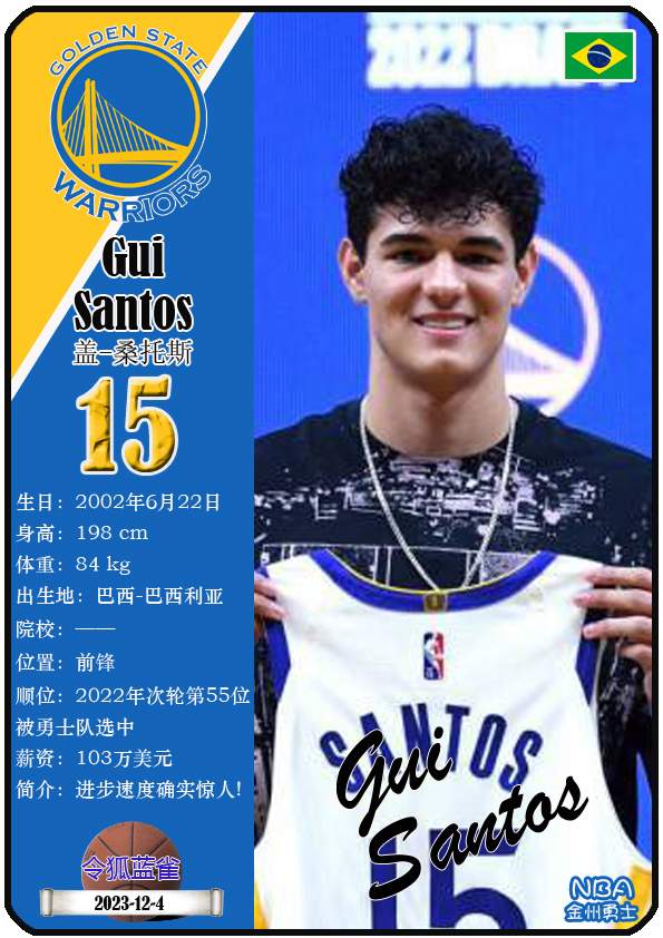 NBA金州勇士队成立于1946年,距今已有79年历史。截至2025年10月26日,球队主教练是史蒂夫·科尔,队内拥有球员斯蒂芬-库里、吉米-巴特勒、德雷蒙德-格林等。本期以球星卡的形式展示目前NBA金州勇士的18名球员(按球衣号码排序):