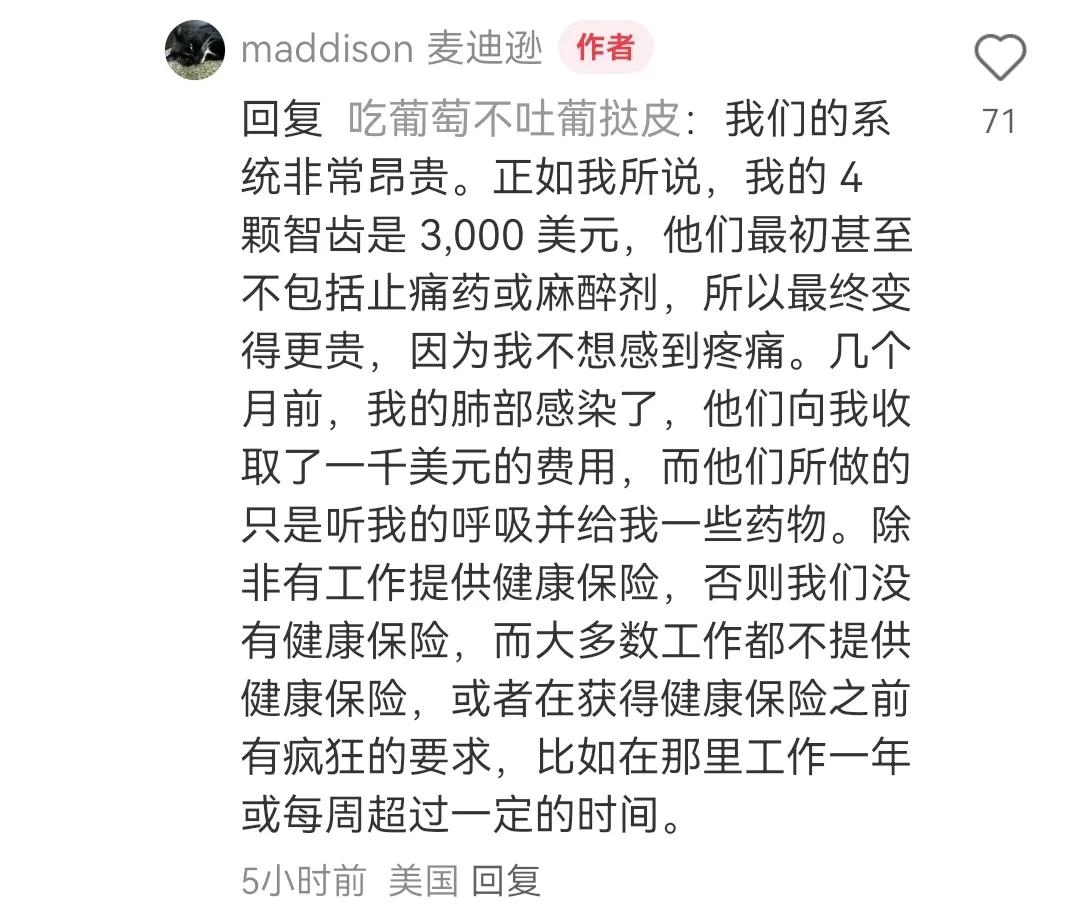 一位网友透露,他每年要支付高达12,000美元的学费,而且每次看病都需要大笔的医疗支出,甚至上个月看病花了7,000美元,但结果只是做了几项检查并拿到了一些药物。