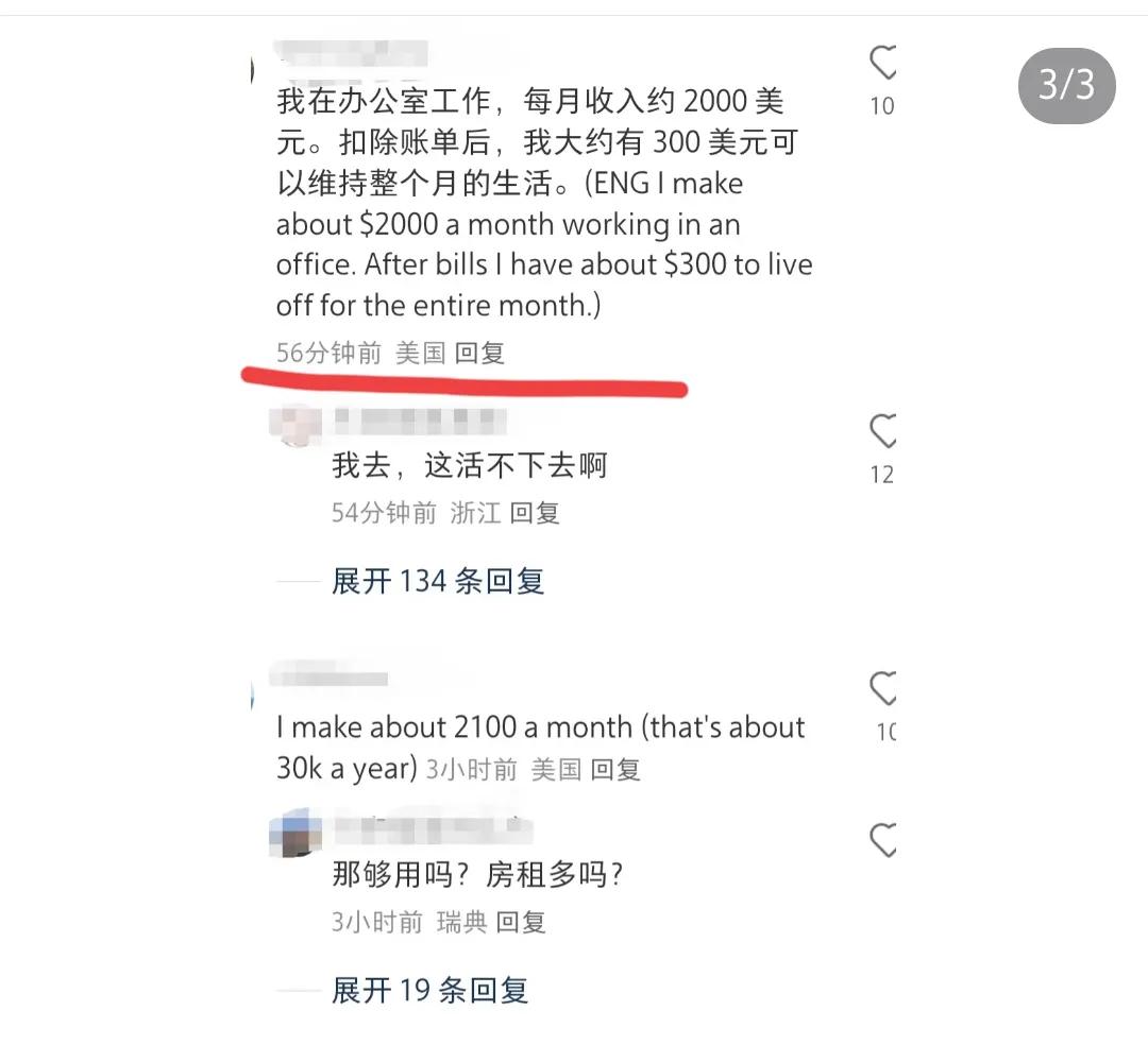 然而,现实中的美国网友却揭露了完全不同的情况。有网友表示,他的工资收入还不错,但大部分收入被税收、账单和租金吞噬,剩余的可支配收入几乎为零。