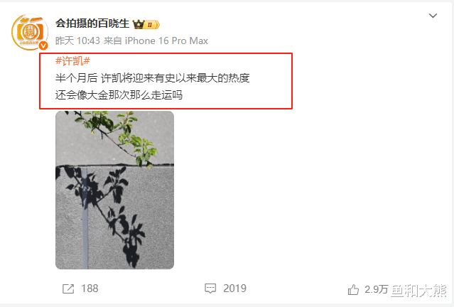 狗仔放出的第一条是“半个月后 ,许凯将迎来有史以来最大的热度,还会像大金那次那么走运吗”?