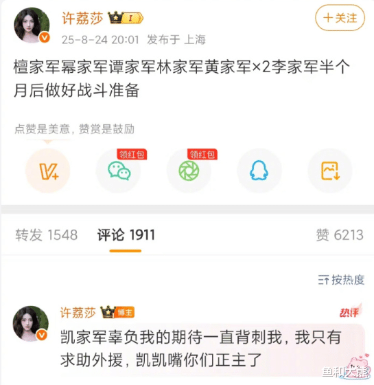 但令人不解的是,许荔莎在发文后不久就将其删掉了,不知道是一时嘴嗨,还是在憋什么大招。
