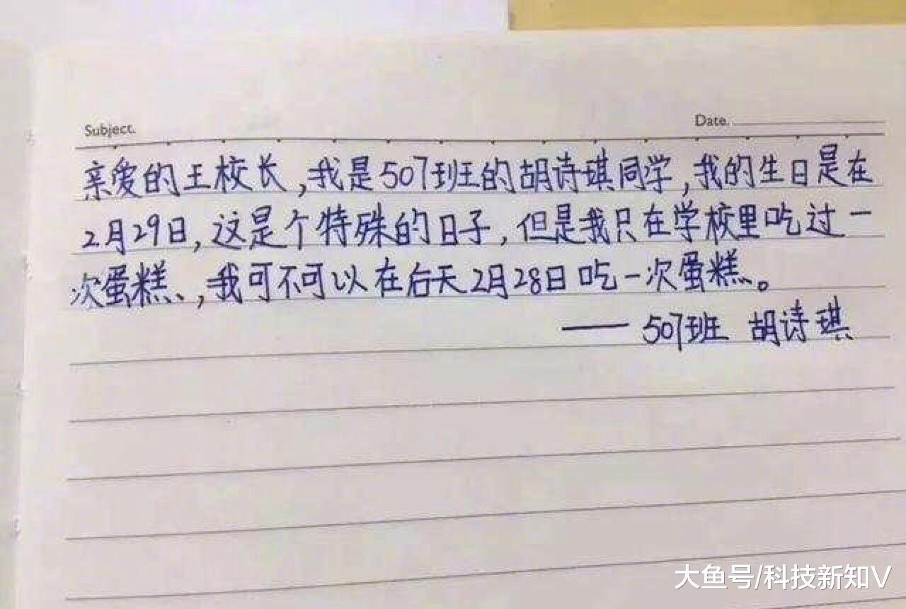【生日快乐!#2月29日出生的孩子#】"亲爱的王校长,我的生日2月29日,这是个特殊的日子,我可不可以在2月28日吃一次蛋糕。"胡诗琪的学校是寄宿制,食堂只按登记的生日发小蛋糕。于是,她写了这封信,校长:"小蛋糕安排上了。""全校唯一2月29日生日的孩子,祝你生日快乐!"