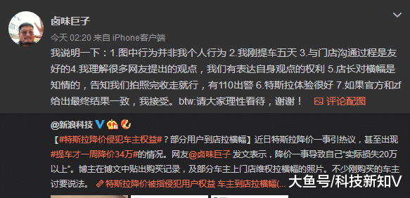 【降价补偿不合理,特斯拉新用户到专卖店拉横幅】 刚刚购买特斯拉的湖南网友@卤味巨子 发文表示,降价一事导致自己“实际损失20万以上”。按照特斯拉信心保障计划,其完全有理由提出退车,但是特斯拉官方及门店没有至今任何说法。 “现在特斯拉门店给出的说法就是老车主六折购买完全自动驾驶包,等于让我们继续少掏钱买它的产品,这个方案个人无法接受。” #特斯拉全系降价#