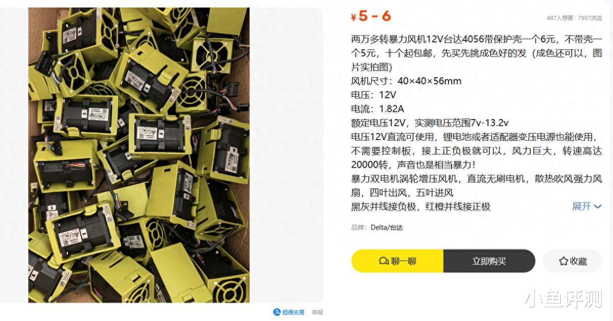 最近在二手鱼上刷到一款12V台达4056暴力风机,标价5元起,带保护壳也才6块,十个还包邮。看到参数我直接愣住:两万多转、1.82A电流、四叶出风五叶进风、直流无刷电机……这配置放在几年前,别说5块,50块都未必能拿下。