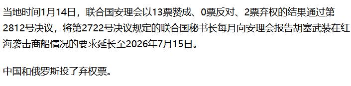 现在安理会通过的第2812号决议,把胡塞武装在红海袭击商船情况的要求延长至2026年7月,这就等于给美国和以色列留出了充足的时间窗口。