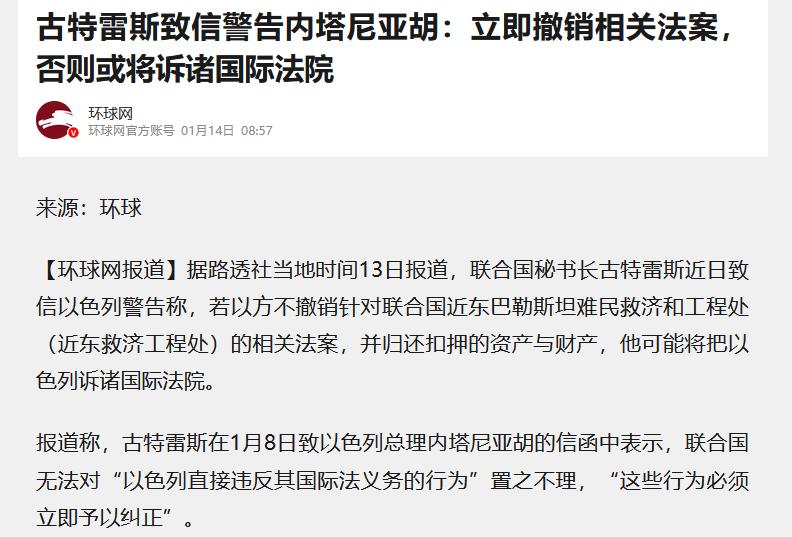 当地时间13日报道,古特雷斯直接给以色列发了一封措辞非常严厉的信函,要求以色列必须立即撤销相关法案,并归还扣押的资产与财产,否则或将诉诸国际法院!