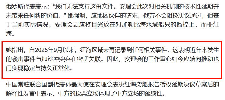 所以,中俄代表在现场也没客气,俄罗斯代表直接摆事实,从2025年9月往后,红海上一片太平,根本没有新的袭击记录,这形势明明都变了,没必要抓着不放。
