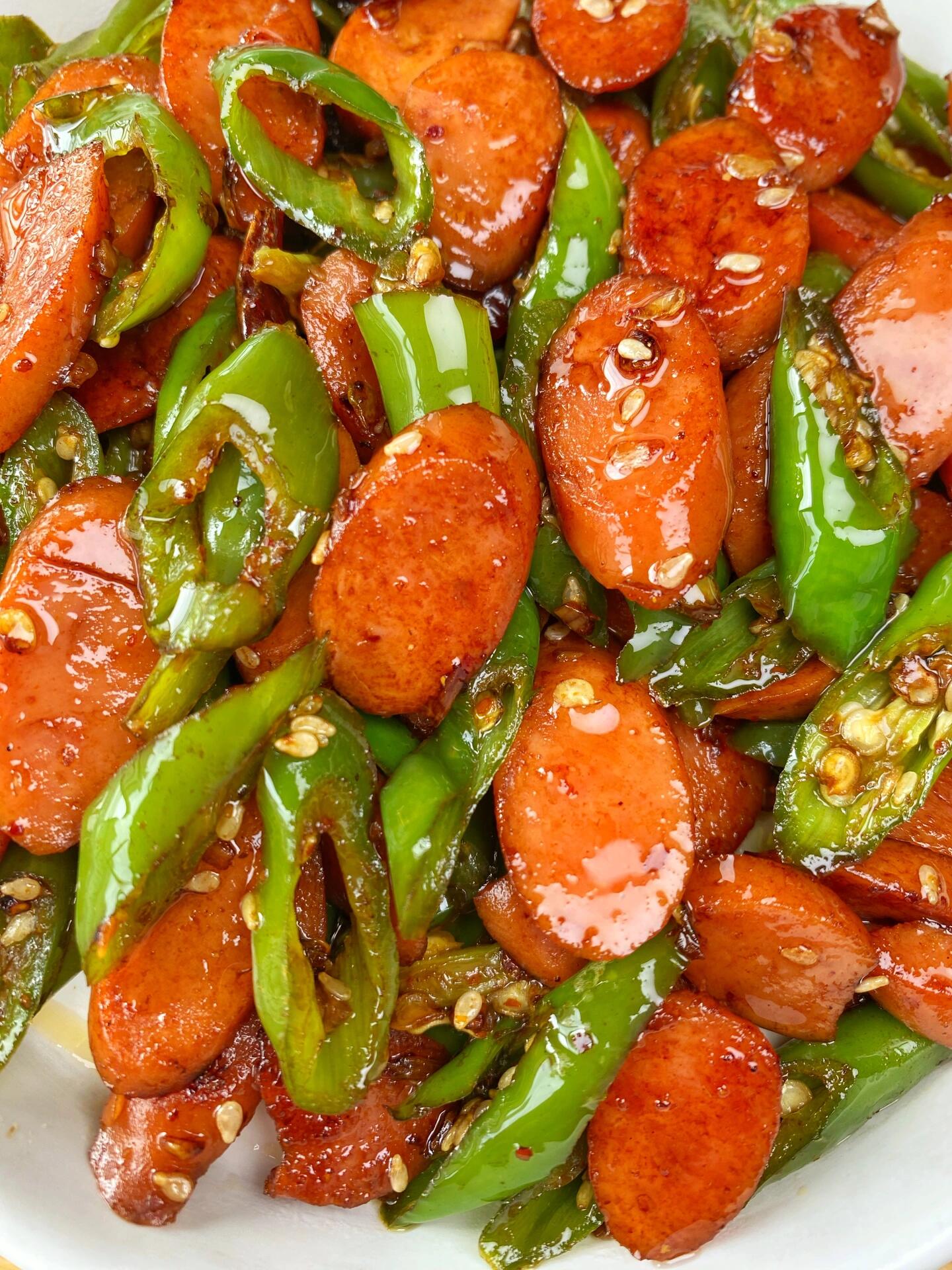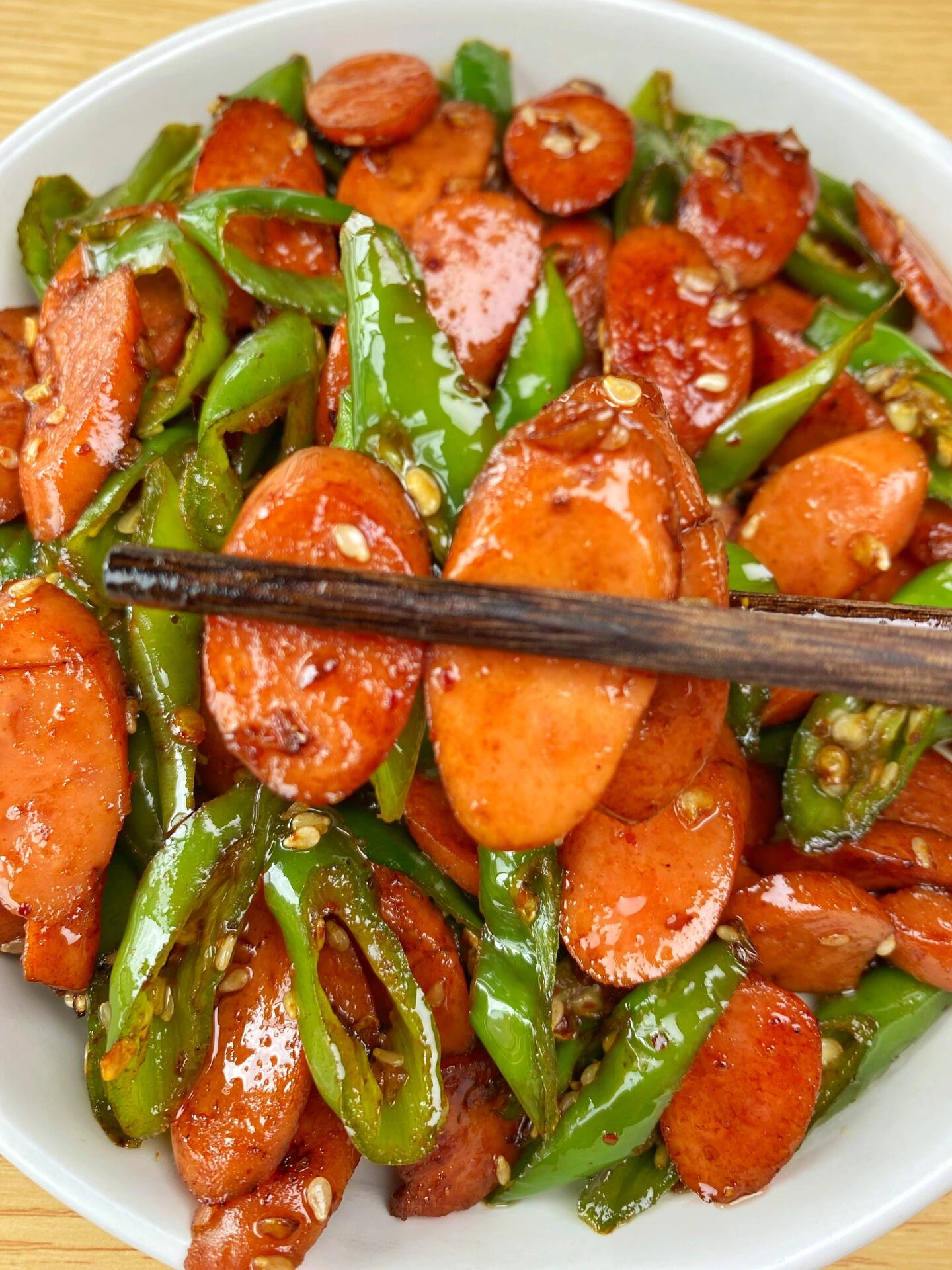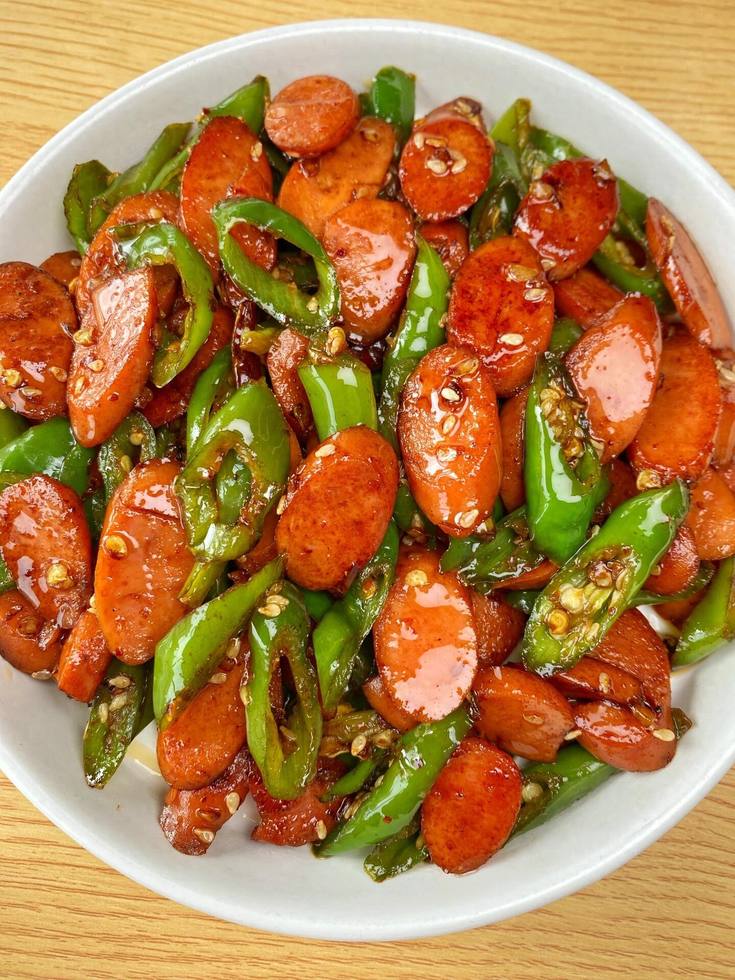 2. 切菜姿势要帅:火腿肠斜刀切硬币厚的片,太薄了炒碎,太厚了硌牙。尖椒去蒂拍扁,揪着把儿往里一捅,籽儿全带出来了,比用刀挖利索。
