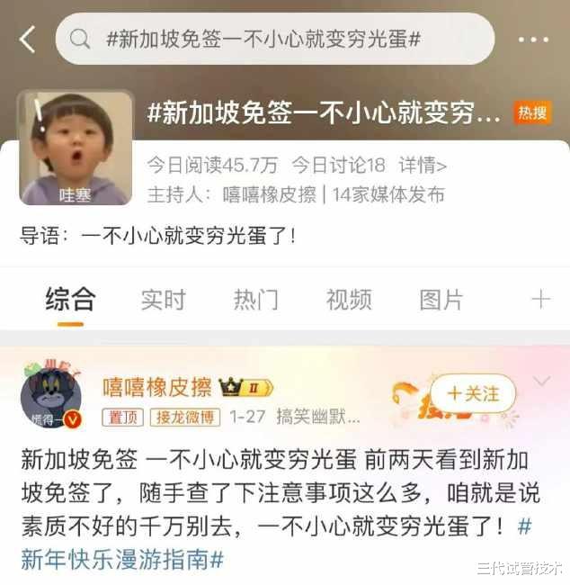这条热搜的大概意思是:新加坡规定和注意事项很多,前往旅游的游客只要稍不注意,就会招来“巨额罚款”:“乐呵呵”出门,“穷光蛋”返家。