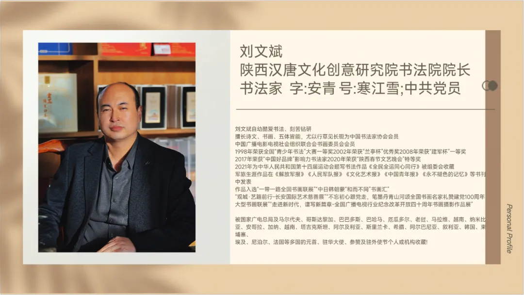墨香飘远,初心不改;笔耕不辍,使命在肩。从刘文斌的笔墨间,我们看到了新时代书法家的坚守与创新;从陕西汉唐文化创意研究院的实践中,我们看到了文化平台的担当与作为。未来,我院也将继续秉持“传承文明、创新表达”的宗旨,支持像刘文斌这样有理想、有担当的艺术家以翰墨为笔、以初心为墨,在中华优秀传统文化传承与创新的道路上,书写属于新时代的“汉唐新篇”,共同为推动社会主义文化繁荣发展、建设文化强国贡献“汉唐力量”!