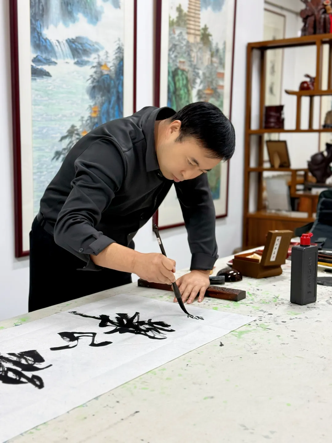 “书法不仅是优秀传统文化传承的基本载体,更蕴含着生命美学的深邃内涵。它早已成为我的生活日常,既能陶冶情操,又能传递真善美。”谈及书法,刘文斌眼中满是热忱。作为中广联书画摄影委员会会员、中国书法家协会会员,他的艺术造诣早已得到业界与大众的双重认可:其作品笔力雄健、气韵生动,刚柔相济、虚实相生,既承古意,又具新声,笔走龙蛇间尽显“墨韵天成”;设计的艺术签名,因兼具个性与美感,深受影视界人士青睐,“神笔骄子”的美誉在书坛广为流传。