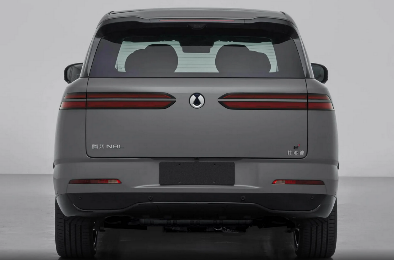 来到腾势N8L的尾部,饱满感和层次感呼之欲出,分段式后尾灯以腾势车标logo为核心向两侧展开,而且尾翼一直延伸至后翼子板处,亮起后对周围车辆能起到很好地警示作用,间接提升行车安全性。该款车的后包围仅采用亮色饰板包覆,看着平平无奇,但恰恰这种简约、干净的风格是当下主流用户所喜爱的。