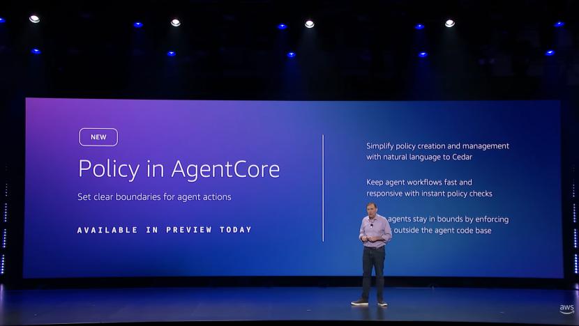 马特·加曼打了一个比方:管理 AI Agent 就像管教青春期的孩子——既要给自由,又要有底线。为此,AWS 推出了AgentCore Policy。不同于以往的模糊提示词,这是一套基于 Cedar 语言的确定性控制系统,能实时拦截 Agent 的违规操作,比如阻止超过 1000 美元的自动退款,解决了企业对 AI 行为失控的根本恐惧。