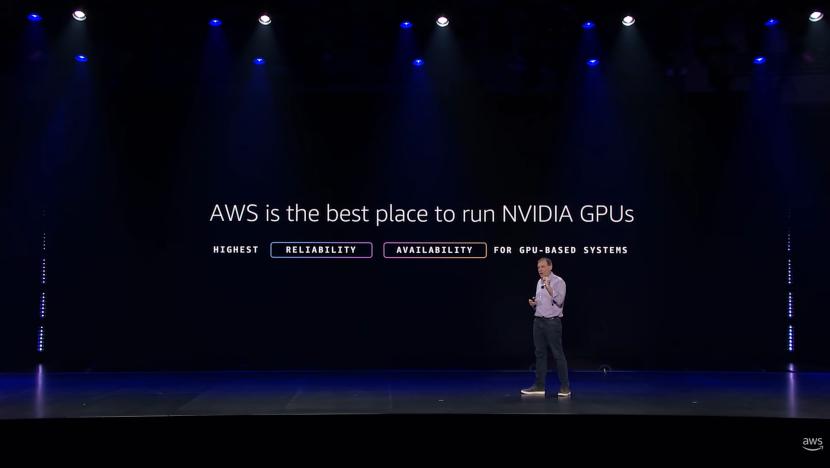 当我们思考AI 基础设施时,首先想到的就是 GPU。在AWS 上运行 NVIDIA GPU 无疑是最佳选择。我们是最早提供云端NVIDIA GPU 的服务商之一,与 NVIDIA 的合作已超过 15 年,这意味着我们已经掌握了大规模运行 GPU 的技术。如果你询问任何在其他供应商处运行过大型 GPU 集群的人,他们会告诉你,AWS 在运行 GPU 集群方面是最稳定的。我们在避免节点故障方面表现出色,并提供最佳的可靠性。