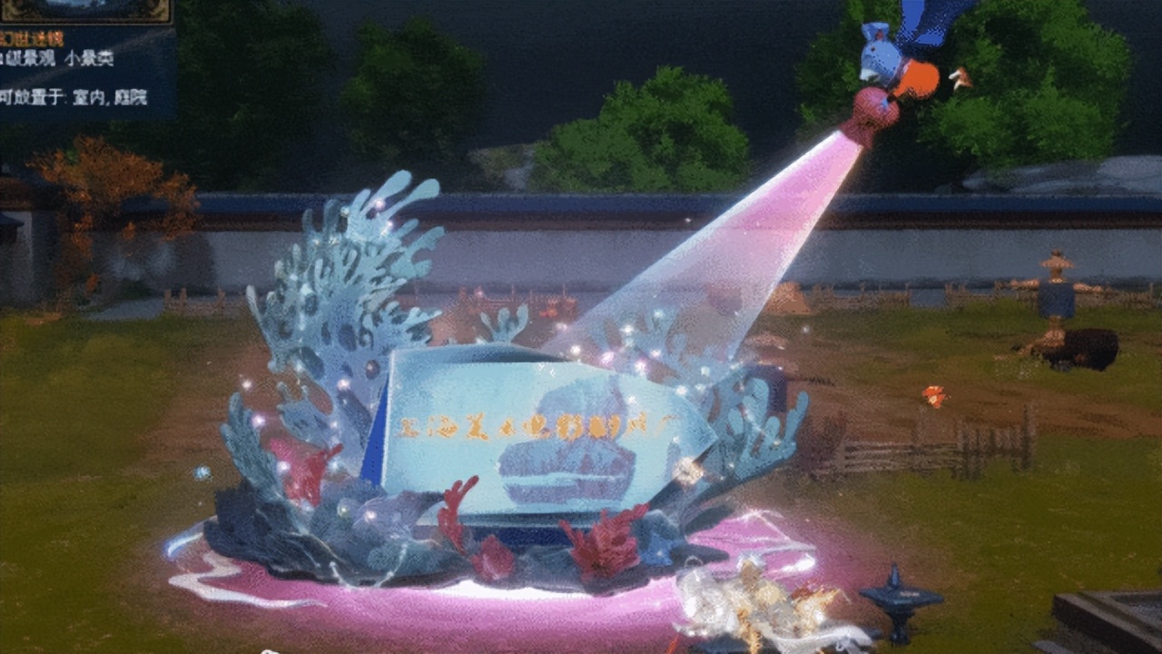 踏入家园,最令人惊喜的莫过于那台独具匠心的联动家具——“幻世迷镜”。它绝非寻常物件,晶莹剔透的“屏幕”由珍稀的冰透石镜打造,仿佛凝结了时光的露珠,更妙的是,整块镜面被灵动婉转的蓝色珊瑚环抱,珊瑚枝桠间荧光点点,如梦似幻,仅是静置于家园,便已是一件艺术珍品。