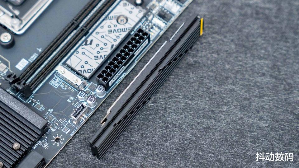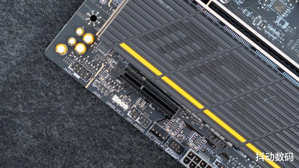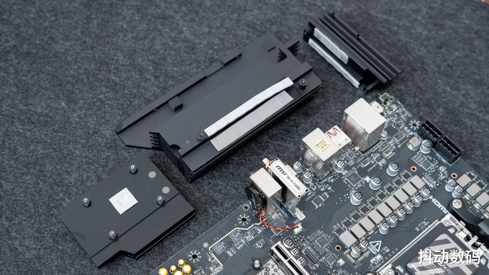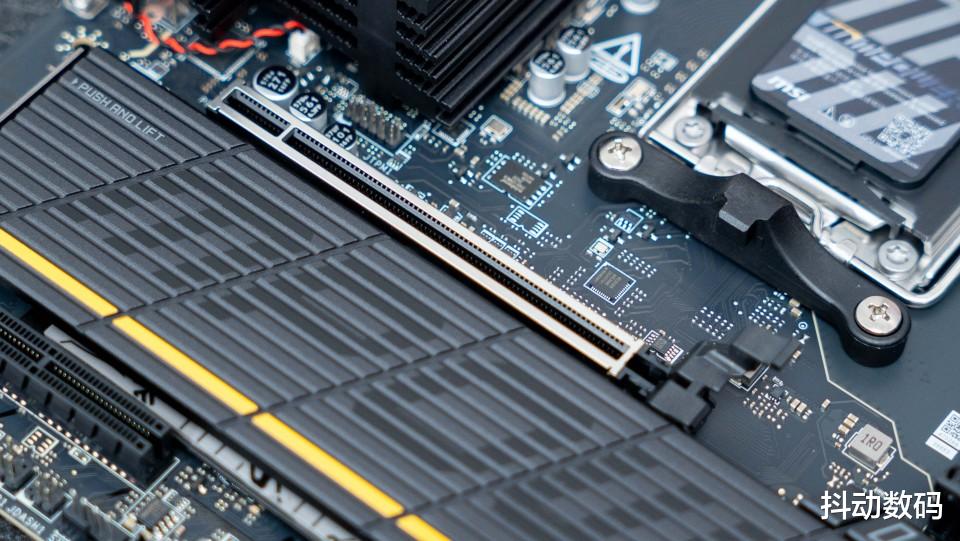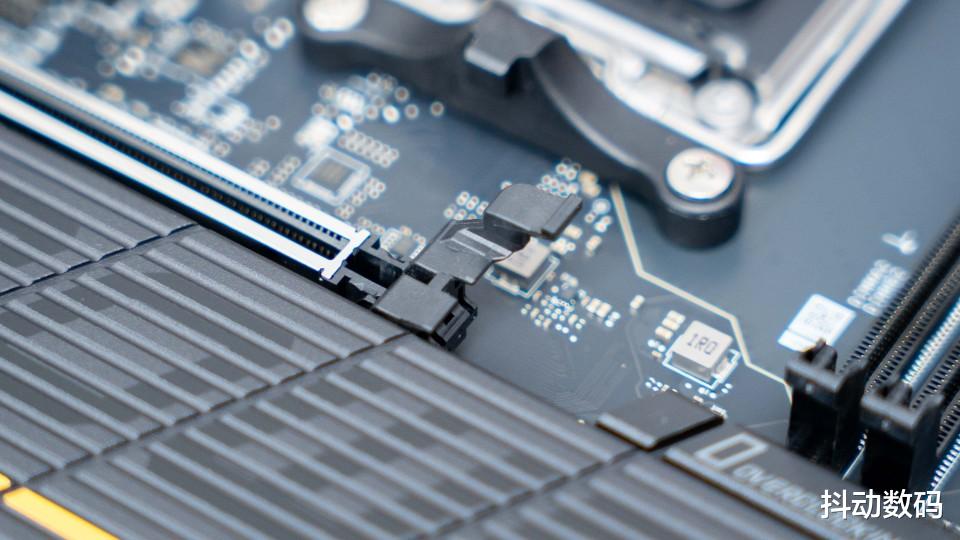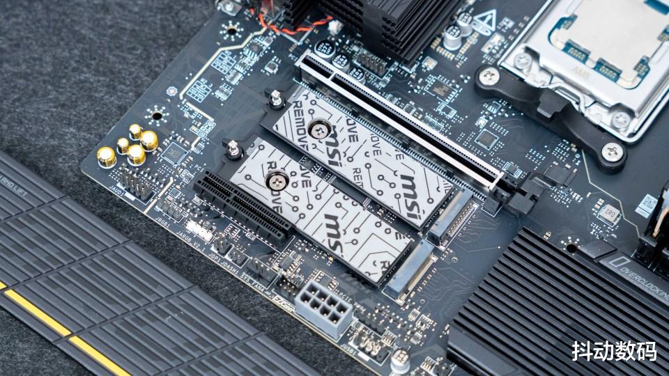 主板正面的三个M.2 SSD接口中两个支持PCIe 5.0 x4设计,另一个则是PCIe 4.0 x4设计。规格方面都是给得很足,方便富哥选择大容量的高速SSD来满足日常存储使用需求。侧面看上去,两款M.2 SSD散热马甲在厚度设计及材质选用方面均达到行业标准的高规格配置。
