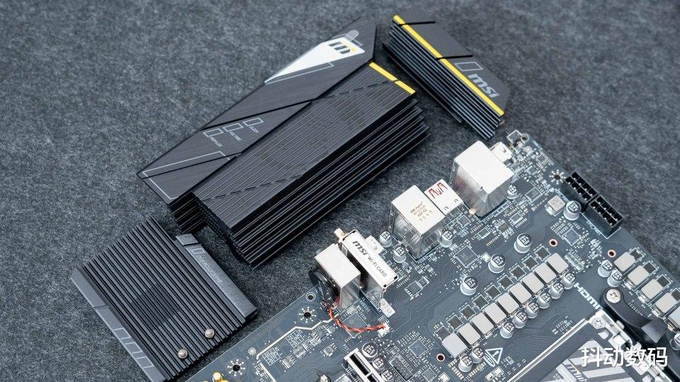 采用双内存槽设计,所以原本这里的空间就增加了一组预装散热片的M.2 SSD槽位。散热片表面还设计了MPOWER字体装饰,另外也通过在散热片表面增加开槽来提升散热效率。