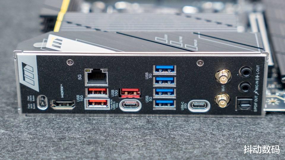 主板后置IO接口,供了7个USB-A接口,其中三个红色是支持10Gbps,四个蓝色的为5Gbps设计。两个Type-C接口则分别是10Gbps和20Gbps设计的,20Gbps的C口倒是蛮少见的。网络接口方面也是好起来了,5G的RJ45有线网口也成了标配,而且WiFi 7无线网卡也都安排了,支持全新的直插设计安装使用方便。