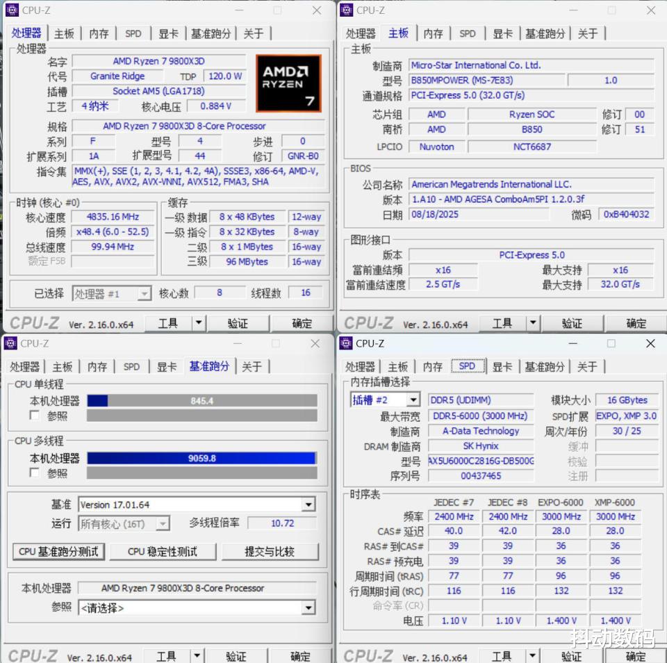 CPU-Z查看9800X3D参数与B850MPOWER主板以及内存参数,CPU-Z Benchmark 测试成绩如图,测试时已开启PBO 2。