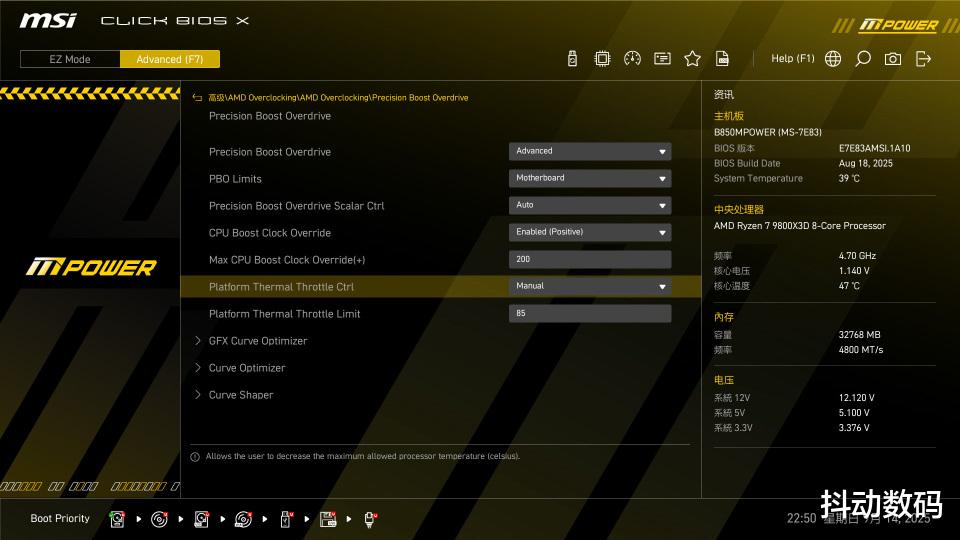 进入后设置PBO模式为Advanced,根据我截图的设置抄作业即可。这里主要开启10X以及提升200频率还有对处理器温度的限制。这里主要是常规操作了,主要是为了提高9800X3D处理器的频率以及对于温度的限制。