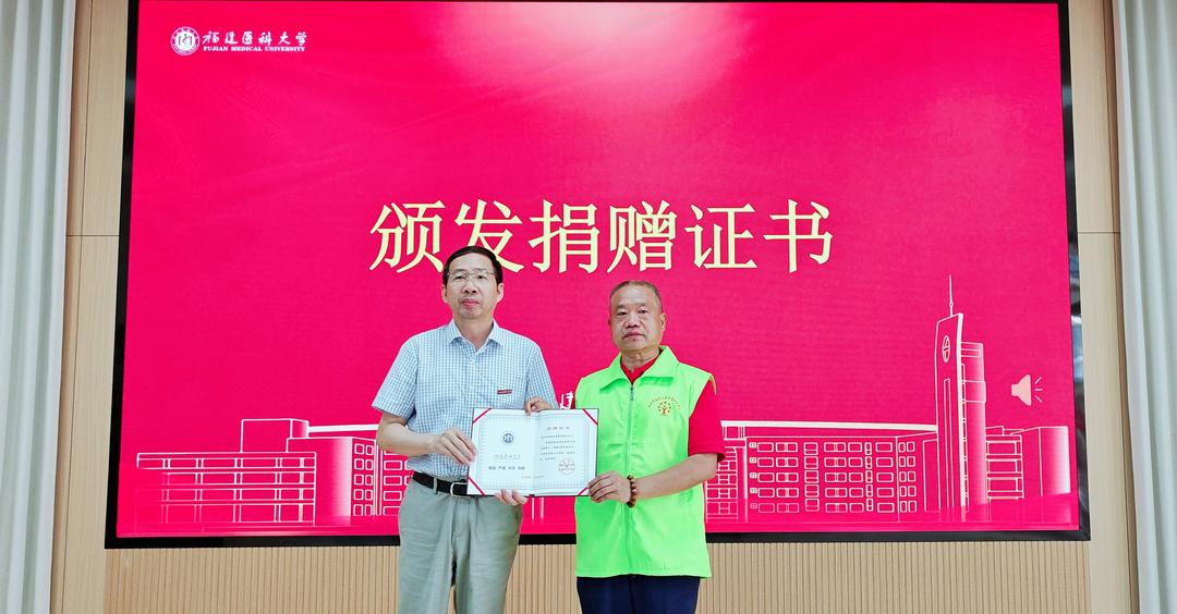 随后,福建医科大学教育发展基金会理事长李凌锋向福州市福延公益慈善服务中心荣誉理事长李靖颁发捐赠证书,以表达福延公益善举的认可与感谢。