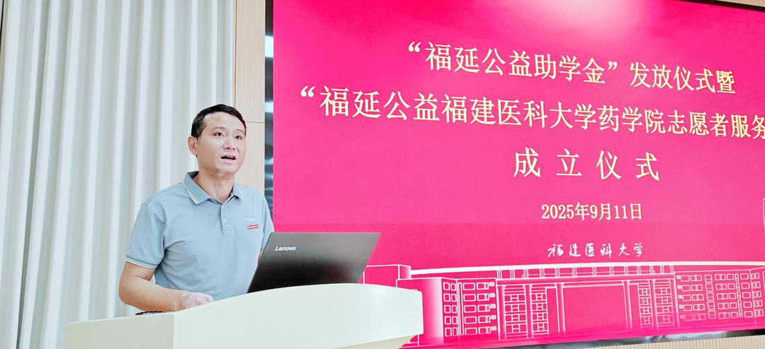 仪式伊始,福建医科大学药学院党委书记陈伟发表致辞,对到场的福延公益代表、爱心企业代表及各界嘉宾表示热烈欢迎,同时向长期关注学院学子成长、助力医学教育事业的公益组织与爱心人士致以诚挚感谢,他提到,此次助学金与志愿者服务队的同步落地,既是对困难学子的雪中送炭,更是对学院育人工作的有力支持,希望师生能将这份善意转化为前行动力。