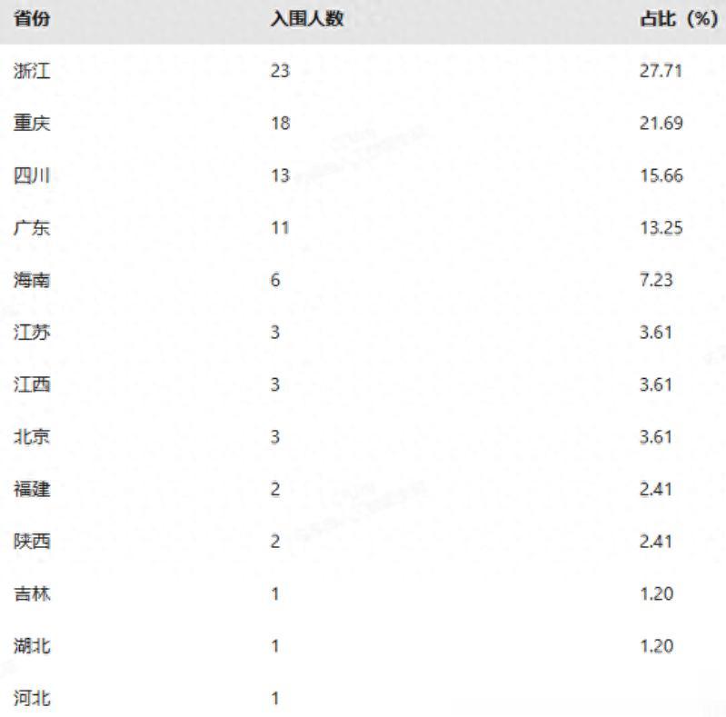 浙江一马当先,共有23人入围,全国排名第一,占比高达总入围人数的27.7%;