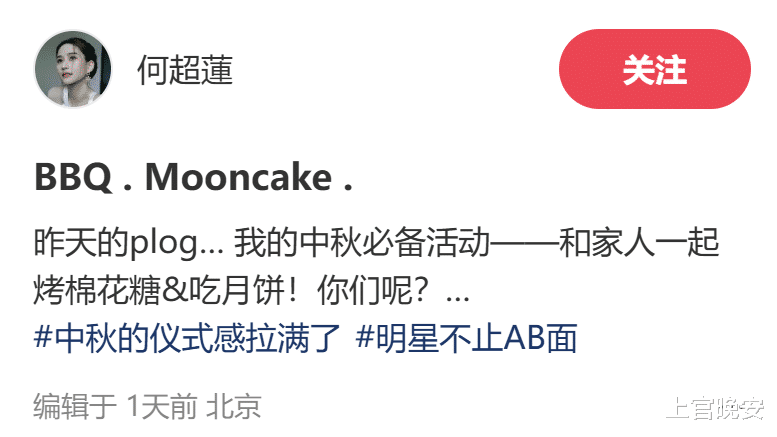根据何超莲的文案,中秋节和家人烧烤是她的必备活动项目。